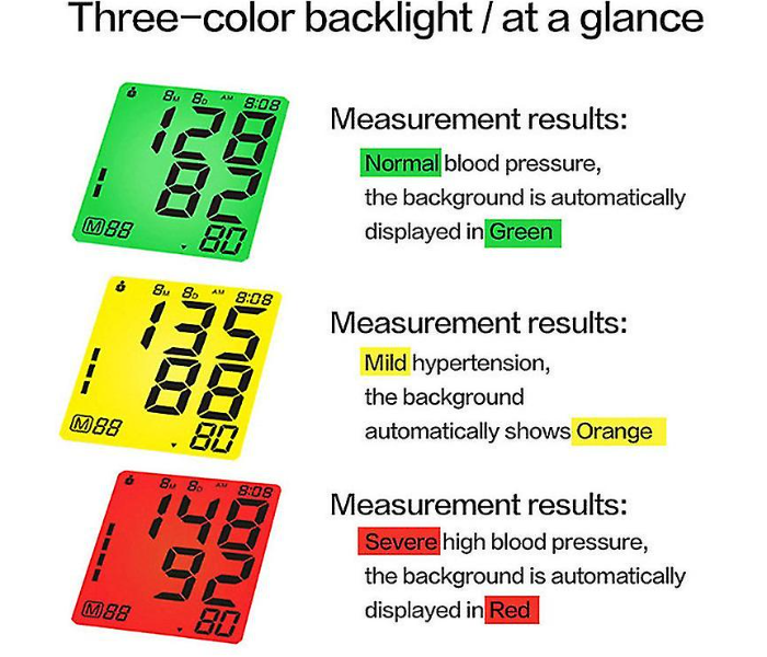 Big and bright screen. Easy to see and read. Three clear colours — green, yellow, red — tell you if your BP is okay, slightly high, or too high. No stress. No need for glasses.