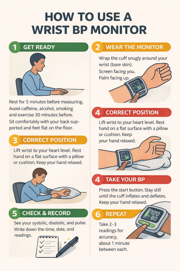 You don’t need to be a nurse or have any medical experience. Just wear it like a wristwatch, press a single button, and your readings appear automatically. Even elderly people can use it without help.